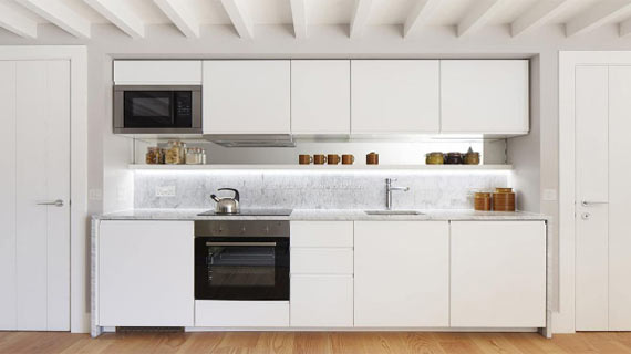 3、廚房天花板相對(duì)間單一些,但是要預(yù)留充夠的電線,可以去商家訂做廚房用品,頂面不要用木質(zhì)產(chǎn)品